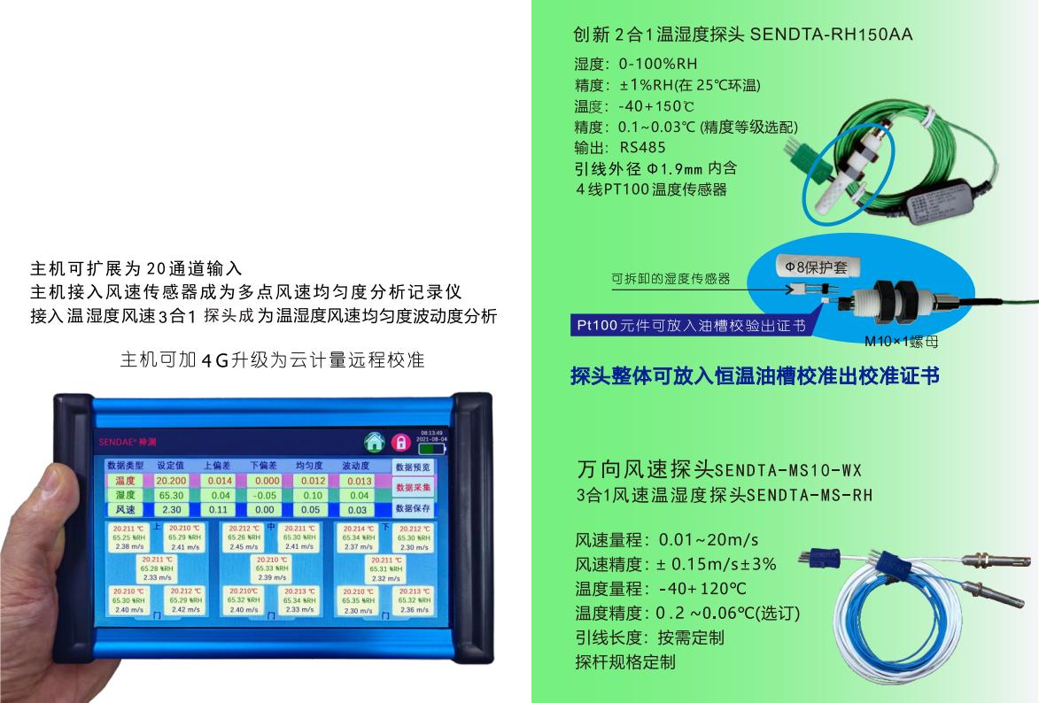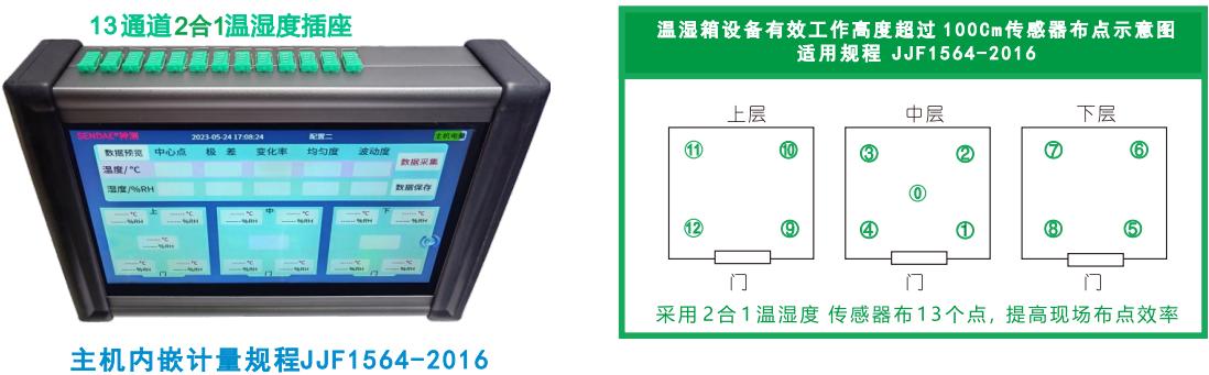 采用創(chuàng)新的SENDTA?-RH 2合1溫濕度傳感器得以誕生創(chuàng)新的13通道主機取代26通道舊模式,創(chuàng)新模式減少現(xiàn)場布傳感器重復(fù)布點工作量,提高現(xiàn)場檢測效率,創(chuàng)新的2合1溫濕度傳感器的較細引線對檢測溫濕箱時引線從門縫引出不會影響關(guān)門的密閉性,保障箱內(nèi)的氣體不外泄,不會因箱門引線影響箱體內(nèi)的溫濕度場均勻度。