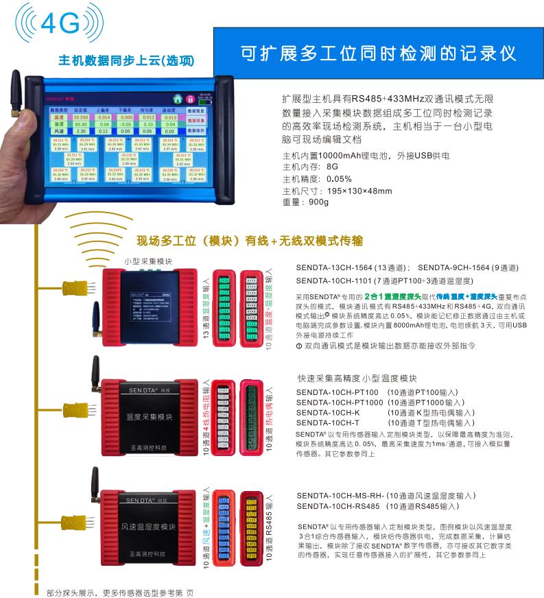 主機基本參數(shù)參考前面的7”觸摸屏內(nèi)容描述:1~400通道以內(nèi)自設(shè)行列格數(shù)(通道數(shù)),可以理解為想一屏看多少通道就設(shè)多少通道,主機以接入 SENDTA的模塊數(shù)據(jù)組成多通道記錄分析儀,主機以接入模塊的 SENDTA傳感器為量程單位而定義主機的類型,比如模塊接入的是溫度傳感器,則主機是溫度記錄分析儀,多個模塊接入不同傳感器則主機是一臺綜合參數(shù)測量記錄分析儀,主機與模塊之間數(shù)據(jù)傳輸以RS485+433MHz(4G)雙模塊雙向通訊。