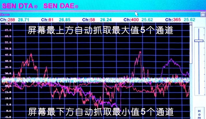 400通道曲線在一屏顯示分析對比屏幕右側(cè)滑塊上下移動調(diào)整量程大小,以便查看超出量程的曲線,屏幕左上角的ch288是所有曲線中較大值通道編號,28.71是即時測得值屏幕左上角的ch365是曲線中第5大值通道值是25.62,屏幕下方抓取較小值5個通道。